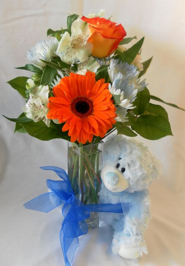 Beautiful in blue… bright and cheery flowers with an added hug from an adorable blue plush bear.