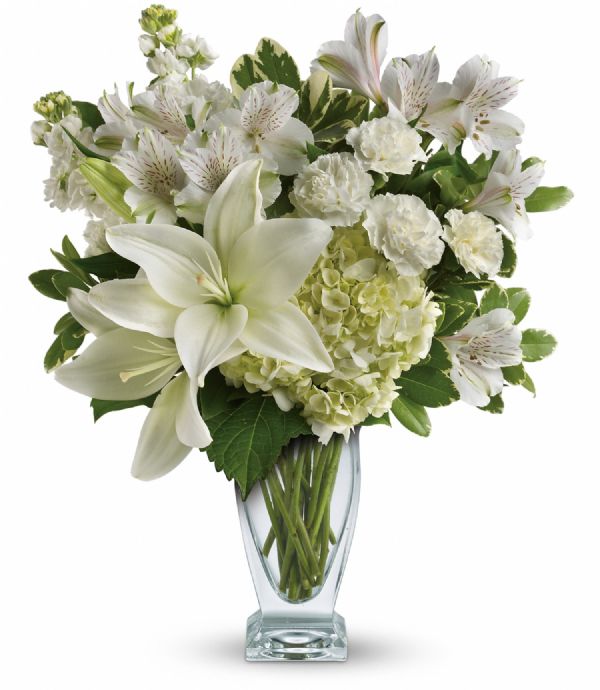 A frothy and fabulous all-white display of pure elegance!  The textures and details of these flowers create a beautiful white wonderland, and come arranged in a lovely glass vase.