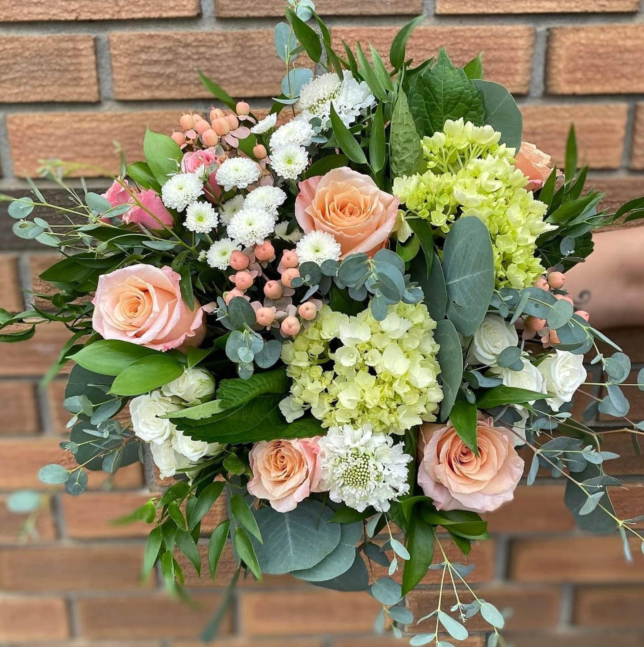 The warm softness of the “Shimmer” Roses are beautifully offset by crisp white and green blossoms, and the textures of assorted eucalyptus foliage, in this hand-tied wedding bouquet.